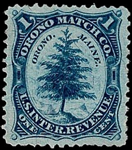 The Orono Match Company and that of its successor, Allen & Powers, were the source of the only two private die match stamps from Maine. The Orono stamps were issued between June of 1866 and August, 1885. 6,992,140 were issued on old paper and 5,360,360 on silk paper. The stamp above is on silk paper.