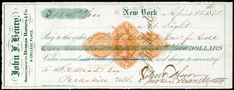 A check written from Henry's account. The revenue imprint on it is an RN D-9. Henry traded heavily on the Barnes name in his early career.