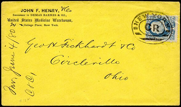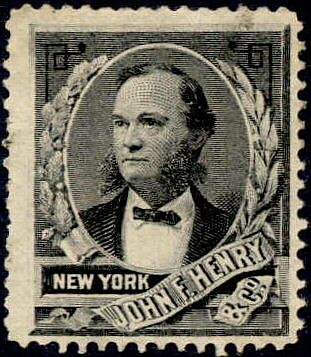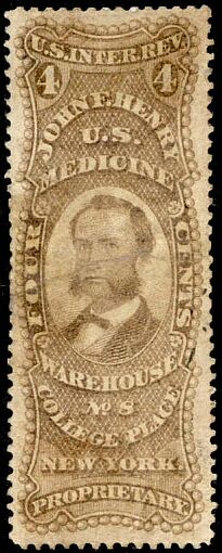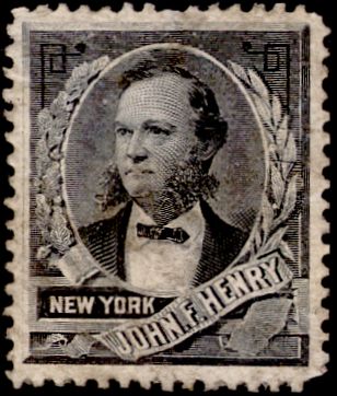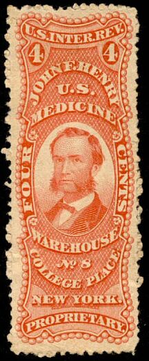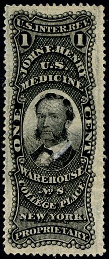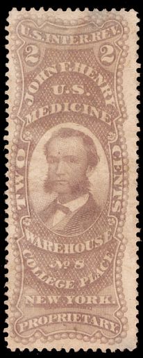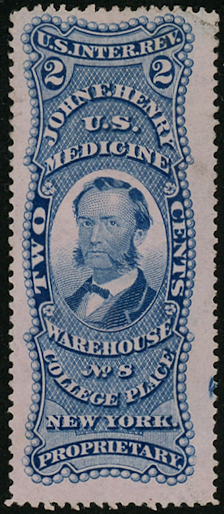 John F. Henry was one of the sons in J.M. Henry & Sons, a proprietary medicine firm operating in the 1850's in Vermont. In 1865 John F. went to New York to work for Demas Barnes. Barnes wanted to run for Congress and pursue other activities, so in 1868 Henry took over as successor. By 1869 Henry must have run out of proprietary stamps from Barnes, so he ordered his own in one, two and four-cent denominations.