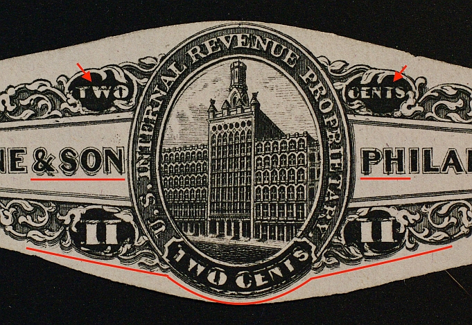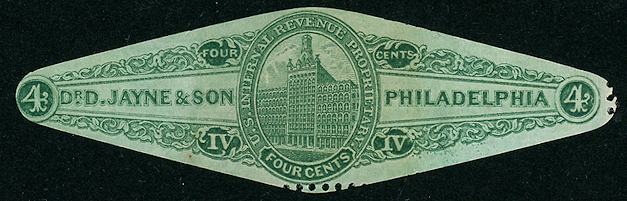In 1883 the company had a facsimile stamp designed for use after repeal of the tax on proprietary medicines. The stamp was slightly redesigned three times. This is the original version.