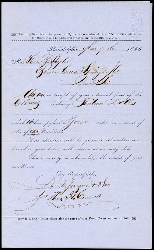An 1855 receipt from the Jane Company. It was used very shortly after the company became Dr. Jayne & Son, and while a notice of the change was printed in the top margin, the text of the receipt still used singular pronouns, which were all changed by manuscript.