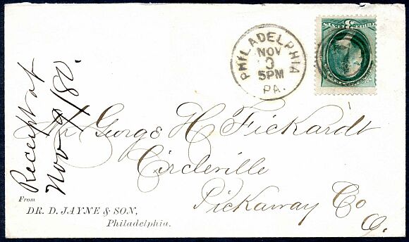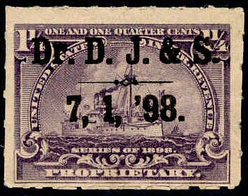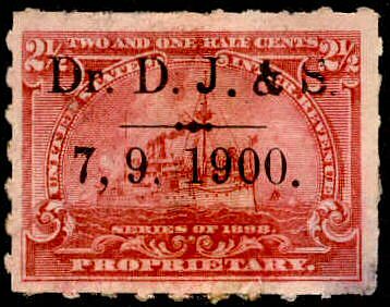 The Jayne firm did not have a private die stamp designed for their use during the Spanish American War tax period. Their cancels can be found on "battleship" proprietaries of the period.