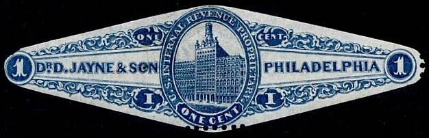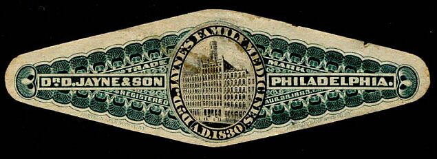 Dr. David Jayne's "Family Medicines" began with Jayne's American Hair Dye and Jayne's Hair Tonic in 1830. Jayne's Alterative was introduced in 1851. In 1855 he joined with his sons David W. and Eben C. Jayne as well as John K. Walker to form the firm Dr. Jayne & Son. Why he did not put "Sons" in the name is not evident.