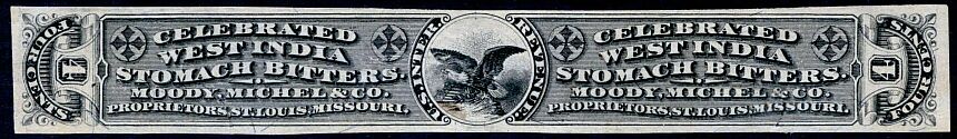Yet another Saint Louis company that seemed to have no connection to medicine had a private die printed for that purpose. Matthew Moody, Joshua C. Michel and Morey T. Andrews were listed in the 1867 City Directory as "wholesale grocers, wines, liquors, cigars." Nevertheless, they had a stamp issued for use on their Celebrated West India Stomach Bitters from July of 1863 until May of 1867. 42,875 were printed, all on old paper.