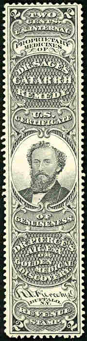Dr. Pierce's first private die stamp was the two-cent black, issued from April of 1870 until February of 1879. 699,624 were printed on old paper, 3,868,624 on silk paper and 2,061,192 on pink and watermarked papers. This one is on watermarked paper.