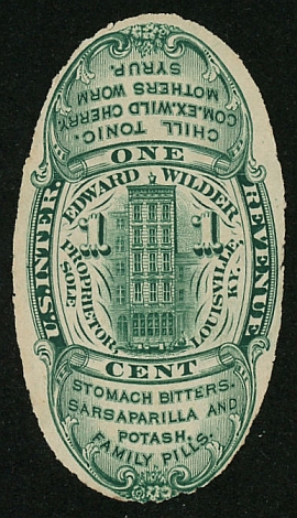 Edward Wilder began to manufacture his range of proprietary medicines in Louisville, Kentucky in 1869. His private die stamps were first delivered later that year, in August. They were last issued on January 28, 1882. The one-cent green was issued both imperforate and die cut. 187,300 were printed on old paper, 183,686 on silk paper and 94,847 on watermarked paper. The die cut copy is on watermarked paper and the imperf copy is on silk paper.