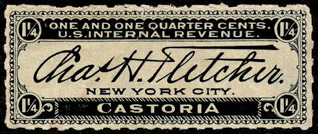 During the Spanish American War Tax period Fletcher decided to adapt the Castoria facsimile for use as an actual private die stamp. The design is similar, but a denomination and the words "U.S. Internal Revenue" were added.