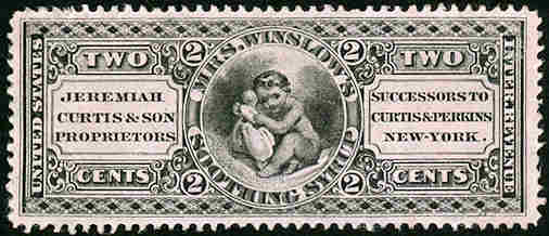 The flagship product of Jeremiah Curtis & Son was Mrs. Winslow's Soothing Syrup, which was first marketed in 1835. It contained a small amount of morphine, and was said to cure all diseases of children. The product was so well known that a movement in a divertimento by Sir Edward Elgar was titled after the remedy. One-cent private die stamps for the company were first issued in February of 1863 and last in 1880. 2,862,188 were issued on old paper and 2,090,000 on watermarked paper.