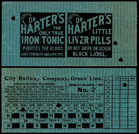 An intercity railroad ticket with Harter Medicine Company advertising. It is not from Saint Louis.