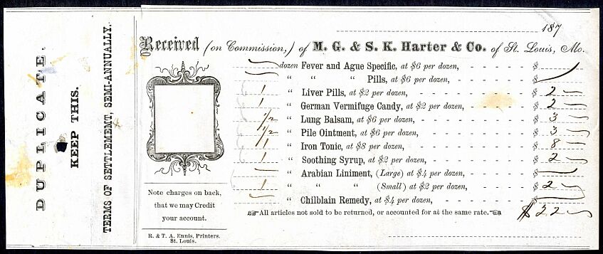 A receipt for purchase of Harter products sometime in the 1870's. The form was printed in early 1870, as it has a place for a revenue stamp, which was only required on receipts from August 1, 1864 to October 1, 1870, but has an 187_ dateline.