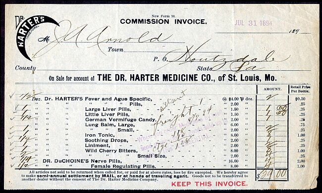 A much later receipt, July 31, 1894. By the end of 1895 mail to the Dr. Harter Medicine Company was being diverted to Dayton, Ohio, and by the end of the decade its business was acquired by the San Antonio Drug Company.