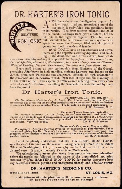 This firm was established in Saint Louis around 1868 by Milton G. and Samuel K. Harter and Thomas W. Boyer, originally Ohio residents. It operated as Dr. Harter & Company for several years, then by 1873 as The Dr. Harter Medicine Company. The company's products included Dr .Harter's Fever and Ague Pills, Dr. Harter's Pile Ointment, Dr. Harter's Little Liver Pills - Do not Gripe or Sicken, Dr. Harter's Iron Tonic, etc.