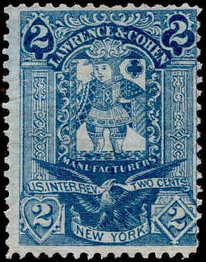 The two-cent Lawrence and Cohen stamp was issued from May of 1865 through July of 1866. A total of 1,149,750 were issued, all on old paper.