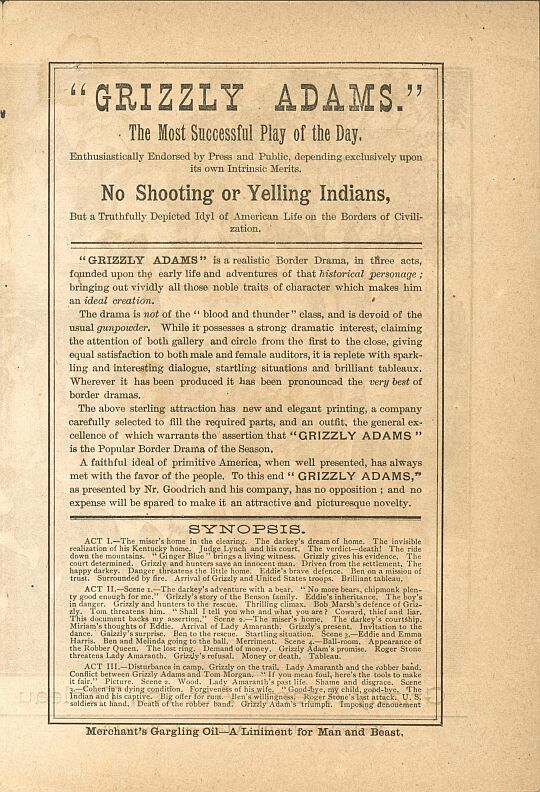 The front of a playbill for Grizzly Adams. A pencil notation dates it from 1879.