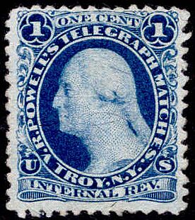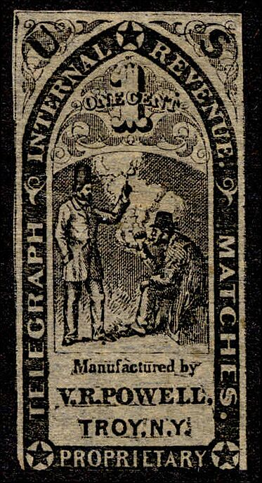 Van Renselaer Powell manufactured matches as early as 1859. He sold the business to Bogardus & Griswold in 1869, and that firm changed to J.M. Bogardus in 1870. Finally it was sold to the Atlantic Match Company under M.C. Miller in 1875. No changes were made to the stamp, which was issued from October of 1864 until July of 1875. 9,571,590 were issued on old paper and 3,195,010 on silk paper. This one is on silk paper.