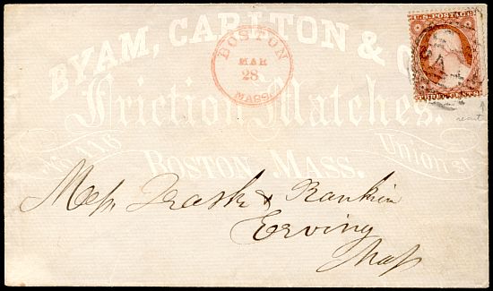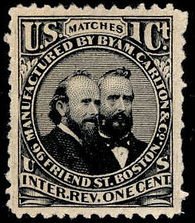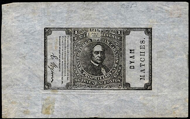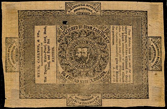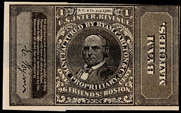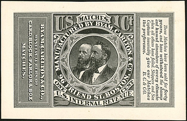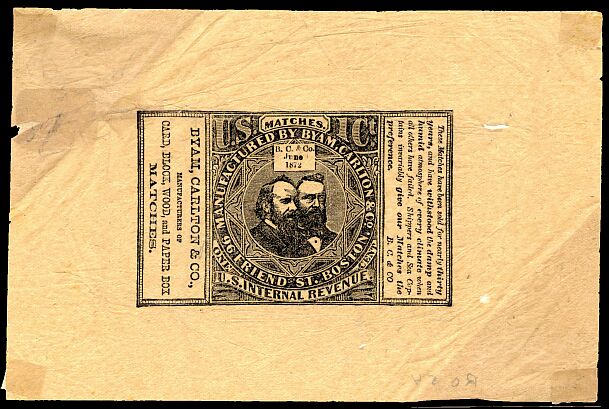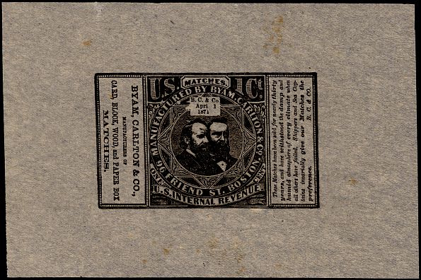 Byam, Carlton and Company used two adhesive stamps and a variety of wrappers with private die imprints on them. The first adhesive stamps were very large ones printed on tissue paper. The others were regular small stamps, issued from May 17, 1866 to December 4, 1882. 13,445,070 were issued on old paper, 8,325,333 on silk paper, and 8,211,000 on watermarked paper. The one shown was printed on watermarked paper.