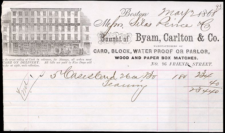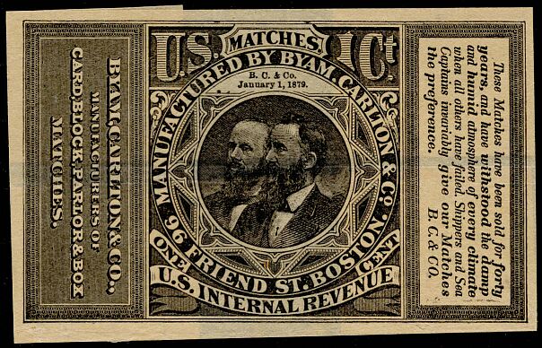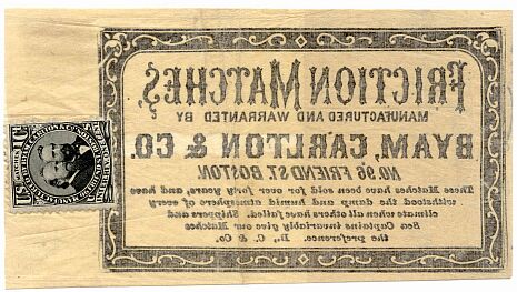 Byam & Carlton had been bought out by the Diamond Match Company by 1881. This wrapper could have been used after the tax ended in 1883, or with an adhesive stamp to pay the tax, if earlier. "For quickness and sureness, the public will find/ These Matches will leave all others behind./ Without further remarks we invite you to try 'em;/ Remember all good that are signed by E. Byam."