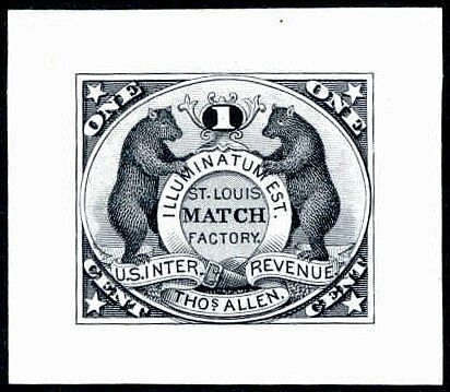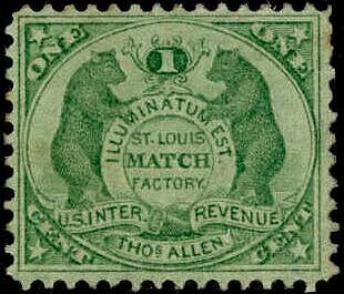 The Thomas Allen match company was located in Saint Louis, but little is known about it. The company appears in the city directory for 1865 through 1868, virtually the same period as the stamps were printed - March, 1865 through July, 1869. 5,943,536 were issued, all on old paper, but few are available today.