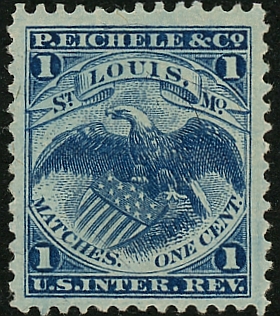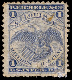 The Eichele companies of Saint Louis, as well as the Thomas Allen Company, were interconnected, but do not appear to have been branches of the same company. Peter Eichele ran a company from 1866 to 1870. From that point, August Eichele began to run the business under the name Eichele & Company. P. Eichele stamps were used from August of 1866 until August of 1875. 33,382,100 were issued on old paper and 40,837,000 on silk paper. The copy above is on silk paper.
