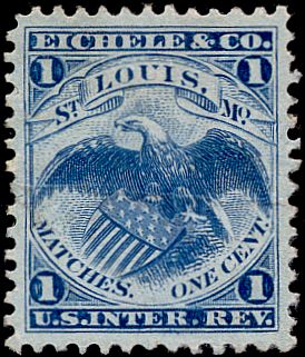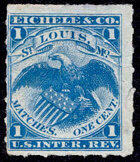 Eichele & Company stamps were issued from February, 1876 until February, 1883, although the company had been bought by the Diamond Match trust around 1881. 131,532,903 of their stamps were issued on silk, pink and watermarked papers. The copy above was printed on silk paper.