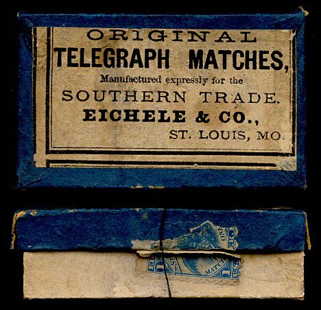 Eichele & Company produced Telegraph Matches. This box shows how the stamps were attached, and generally destroyed.