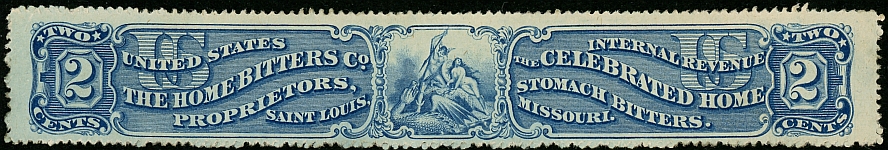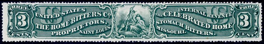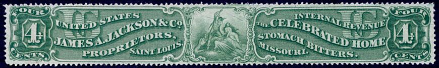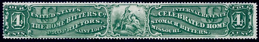 In April of 1875 the Home Bitters Company took over from Jackson, Pfouts & Douglas. They had stamps printed in three denominations beginning with the four-cent green, first issued in June of 1875 and last issued March 3,1883. 271,514 were released on silk paper and 213,617 on watermarked paper. The copy above is on silk paper.
