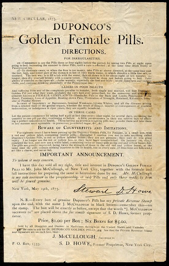 A box for Duponco's Pills sold under McCullough proprietorship.