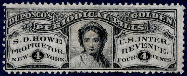 Although Stewart (or Stuart) D. Howe acquired Duponco's Golden Periodical Pills in 1866 and had a design approved for issue that year, it was not until February of 1870 that the first of his private die stamps were issued. These were printed until Howe sold the product to Kidder, Wetherill & Company in 1873. The final delivery of stamps with Howe's name was March 25 of that year. 53,727 were issued on old paper and 30, 415 on silk paper. The copy shown is on old paper.