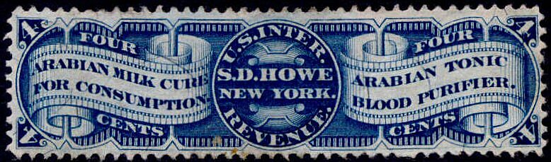 The stamp for Arabian Milk Cure (For Consumption and Diseases of the Throat, Chest and Lungs) was first issued in October of 1871 and continued until September 4, 1882. 238,962 were issued on silk paper and 11,660 watermarked paper. The copy above is printed on silk paper.