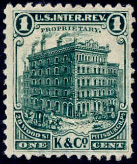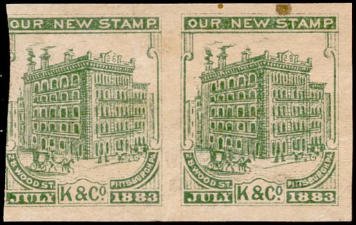 Kennedy apparently reduced the price of Golden Wonder or decided to supply it in smaller bottles, as the one-cent green stamp was issued under the name "K. & Co." from June14, 1881 until January 24, 1883. 567,000 were printed, all on watermarked paper.