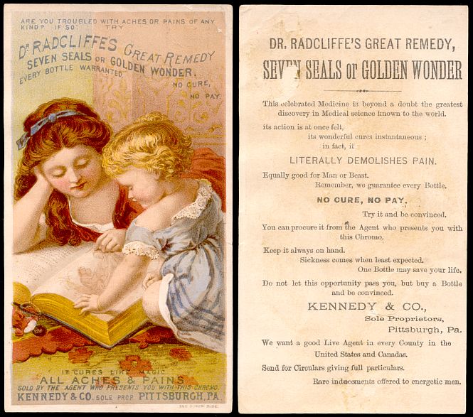 R. Monroe Kennedy was located in Pittsburgh. He was responsible for the production of Dr. Radcliffe's Great Remedy, The Great Vegetable Pain Destroyer, Seven Seals or Golden Wonder - that's the name of one nostrum, not four.