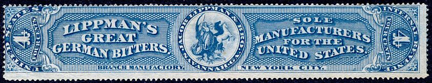 Jacob Lippman and his brothers Lewis and Lawrence manufactured Lippman's Great German Bitters in Savannah, Georgia and New York City. Their private die stamps were issued from November of 1870 until December of 1874. 55,875 were printed on old paper and 23,724 on silk paper. The copy shown is on old paper.