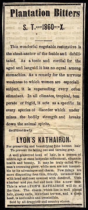 One of the primary products offered by Lyon Manufacturing Company was Mexican Mustang Liniment. Another was Lyon's Kathairon, a hair tonic. They were also offering Plantation Bitters in the 1872 advertisement at the right. This may have been their substitute for Drake's Cabin Bitters, which it seems they would have mentioned by name if they had been authorized to sell.