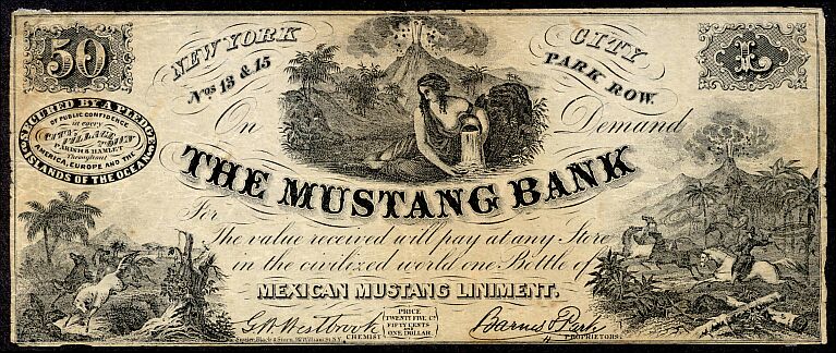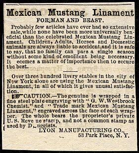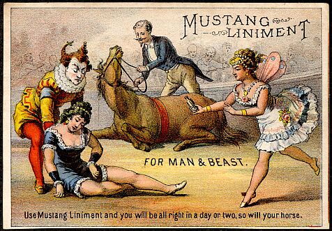 An advertising card for Mexican Mustang Liniment. "So long as human ills endure, And mortals suffer pain, So long shall MUSTANG LINIMENT Its glorious name maintain."