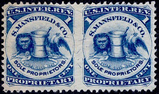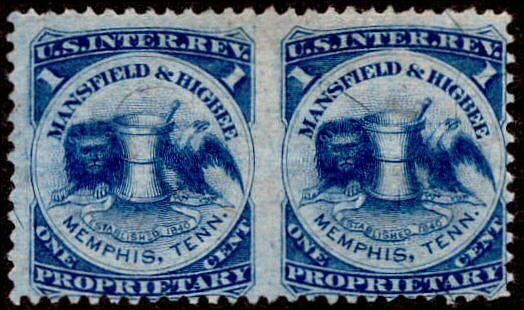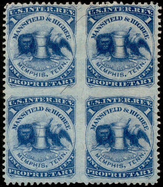 Samuel Mansfield began as an apothecary in Memphis, Tennessee, in 1840. Around 1870 he entered into partnership with Hugh H. Higbee to act as agents for and to manufacture proprietary medicines. These included Mansfield's Hungarian Balsam for the Lungs, Mansfield's Eclectic Pile Salve and Mansfield's Mississippi Diarrohea Cordial, among others. The company ordered a private die stamp, and instructed Joseph R. Carpenter to perforate some in sets of four and some in pairs in addition to regular full perforation.