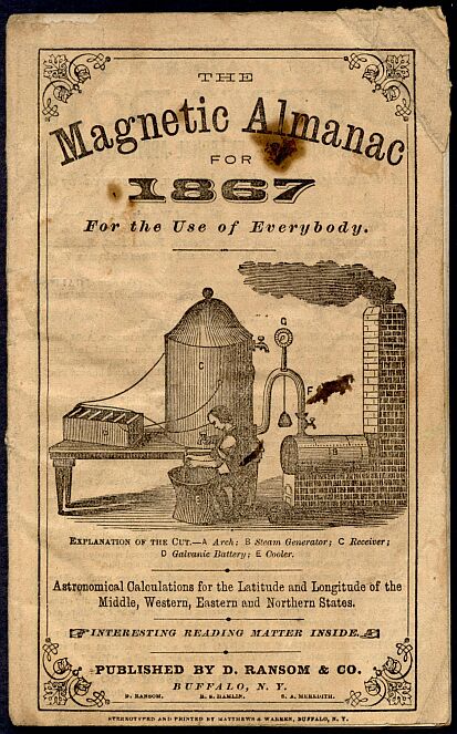 An 1867 almanac from D. Ransom & Company. The illustration on the front looks like something that could have inspired Rube Goldberg.