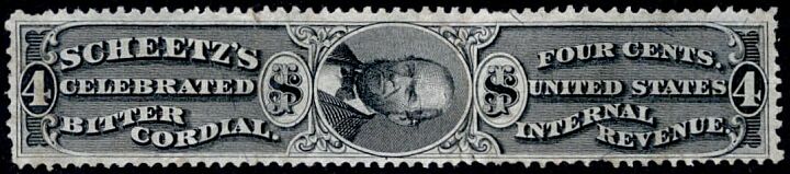 Little is known about Jacob Scheetz or his Celebrated Bitter Cordial. His firm appears in the Philadelphia City Directory in 1870, but his private die proprietary stamp was first issued in July, 1872. It was last issued in August of 1875. 47,425 were printed, all on silk paper, and 10,500 of those were left imperforate. Both the perforated and imperforate varieties have their own catalog numbers.
