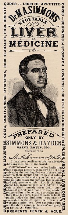 Doctor M.A. Simmons first practiced medicine in Georgia, where he brewed up Simmons Liver Medicine (curing costiveness, lowness of spirits, colic, foul breath, dyspepsia, etc.) and drove through the countryside with a five-gallon keg of it, dispensing however much anyone wanted to buy. He moved to Mississippi, first living in Holly Springs, but located in Iuka when the proprietary medicine tax became effective in 1862. His private die stamp was not issued until December of 1875. It was last delivered in December of 1879. 356,683 were printed on silk and watermarked papers, mostly on silk paper. The copy above is on silk paper.
