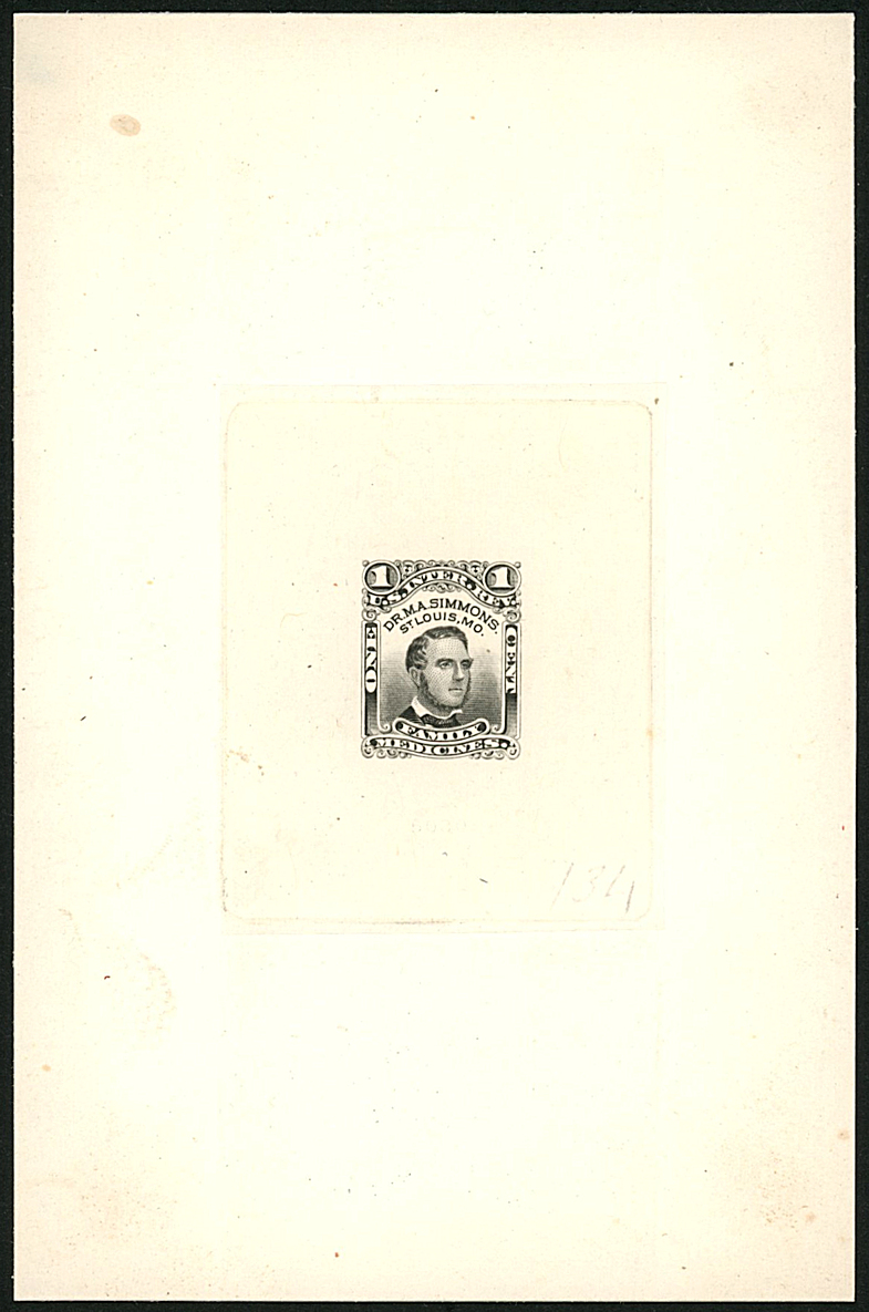 A plate proof of the Saint Louis stamp on India paper sunk on card. From the Morton Dean Joyce collection.