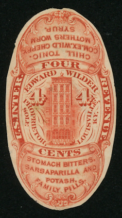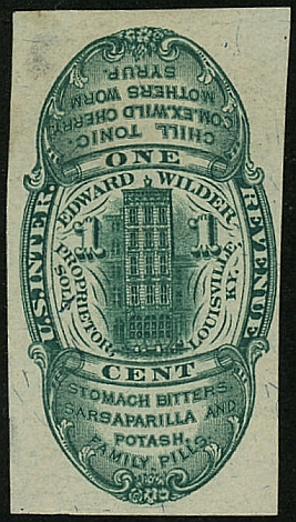 Edward Wilder began to manufacture his range of proprietary medicines in Louisville, Kentucky in 1869. His private die stamps were first delivered later that year, in August. They were last issued on January 28, 1882. The one-cent green was issued both imperforate and die cut. 187,300 were printed on old paper, 183,686 on silk paper and 94,847 on watermarked paper. The die cut copy is on watermarked paper and the imperf copy is on silk paper.