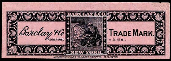 The Barry stamp was registered in the name of Barclay & Company, "importers." This frim apparently took over the Barry products in 1873. A new design of the stamp was issued from March, 1874 until August 23, 1882. 466,875 were printed on silk paper and 645,259 on pink and watermarked papers. The copy above is on silk paper.