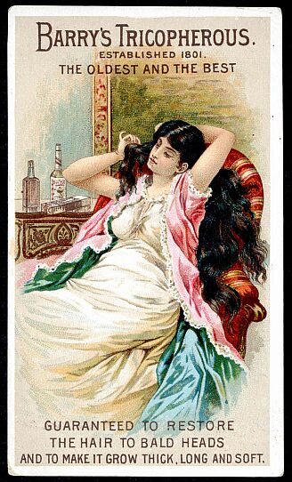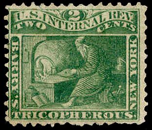 Alexander C. Barry was a wigmaker in New York City before introducing "Tricopherous, or Medicated Compound for Restoring, Preserving and Beautifying the Hair; Eradicating Scurf and Dandruff, to prevent Baldness and Gray Hair; Curing Diseases of the Scalp; and useful in Stings, Cuts, Bruises, Sprains, &c., &c." Private die stamps for this product were issued from June, 1865 through February, 1874. 554,375 were printed on old paper and 323,500 on silk paper. The copy above is on silk paper.