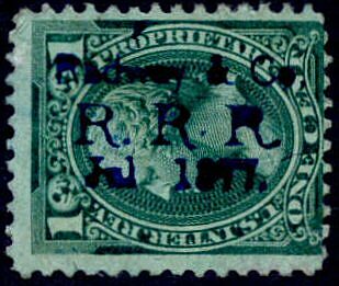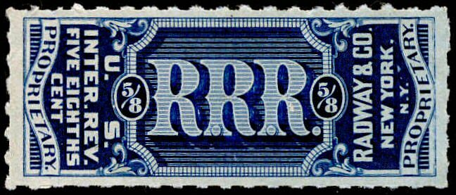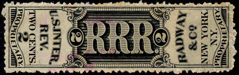 J. & R.G. Radway & Company was formed around 1848 to produce and market Radway's Ready Relief, Conqueror of Pain. Then came Radway's Regulating Pills and Dr. Radway's Sarsaparillan Resolvent, among others. Their private die stamp was first issued February 1, 1867 and last delivered March 1, 1883. 2,416,000 were printed on old paper, 4,394,976 on silk paper and 2,143,226 on pink and watermarked papers. This copy is on watermarked paper.