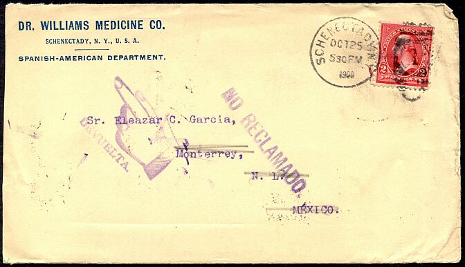A Williams cover mailed from Schenectady to Mexico City in 1900.
