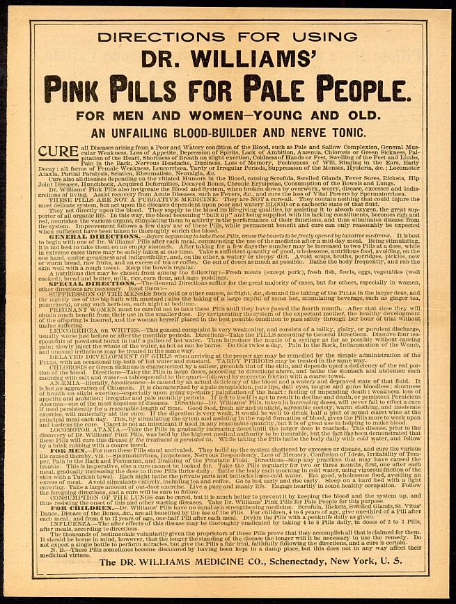 Pink Pills for Pale People were first produced in Brockville, Ontario. In the late 1800's Willis T. Hanson of Schenectady, New York acquired sole distribution rights for the United States, and The Doctor Williams Medicine Company was set up with brances in New York and Ontario. In several more years there were branch offices in London, Paris, Sydney, Cape Town, Bombay, Rio de Janeiro, and Mexico City. Apparently, though, there was no Doctor Williams associated with the company, and never had been.