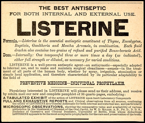 Another Listerine advertisement from the early twentieth century. Even at the time it was advertised as being good for the teeth, just as it is sold today.