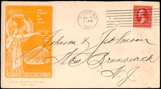 A Meyer Brothers cover promoting the Saint Louis World's Fair, which was originally scheduled for 1903. It was addressed to Johnson and Johnson, a medicine company that had its own private die proprietary stamps.