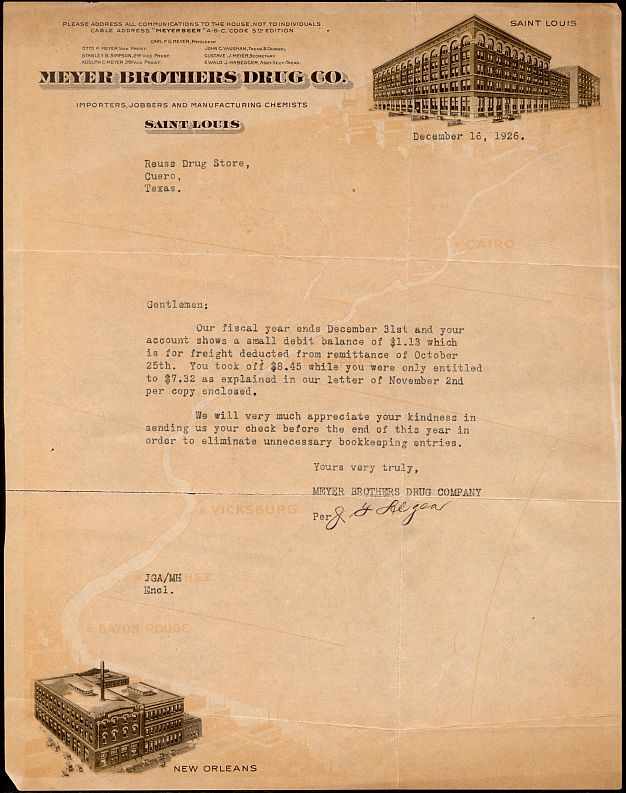 A 1926 letter on Meyer Brothers stationery. It has an underprint representing the Mississippi River connecting their Saint Louis and New Orleans locations.