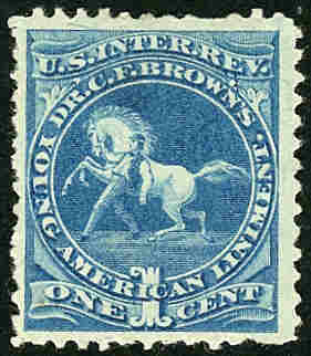 Doctor C.F. Brown's Young American Liniment may have been marketed out of New York City, but little is know of it. It must have been somewhat successful, as private die stamps were issued for it from September, 1870 through May 17, 1883. 90,720 were printed on old paper, 262,290 on silk paper and 258,732 on watermarked paper. The one above is on silk paper.