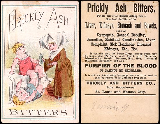A Prickly Ash Bitters trade card. Note that it warns, "It is not an intoxicating beverage nor can it be used as such by reason of its Cathartic Properties."